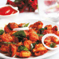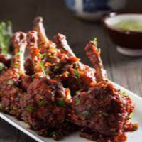 CRISPY CHICKEN LOLLYPOP, BELLPEPPER, ONION TOSSED IN CHINESE SPICY SAUCE