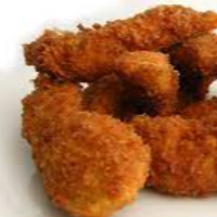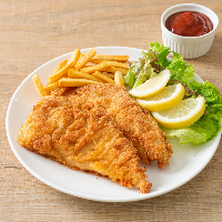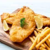 THIN SLICES OF FISH FRIED IN CRISPY BATTER SERVED WITH POTATO CHIPS / FINGERS AND TOMATO SAUCE