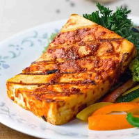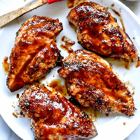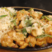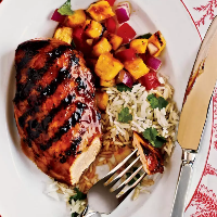 BONELESS CHICKEN BREAST MARINATED IN HOISIN SAUCE SERVED WITH GRILLED TOMATO, EXOTIC VEG & FRIED RICE