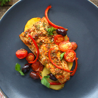 GRILLED MARINATED FISH IN CHOICE OF SAUCE SERVED WITH EXOTIC VEGETABLE AND MASHED POTATO