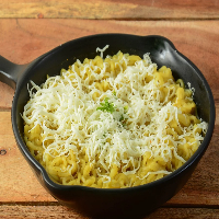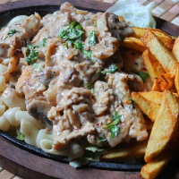 MUSHROOM COOKED IN ITALIAN STYLE CHESSE CREAM SAUCE, SERVED WITH SCHEZWAN NOODLES AND CARAMALISED ONION