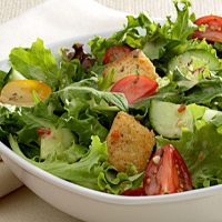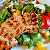 CAJUN SPICE MARINATED CHICKEN CUBES, LETTUCE, CUCUMBER, CHERRY TOMATO, TOMATO TOSSED INSOUR CREAM DRESSING
