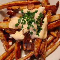 FINGER POTATO FRIES , MINCE VEGETABLE TOPPED WITH CREAM CHESSE