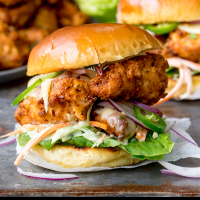 WARMM BUNS WITH COCKTAIL SAUCE, PANNER STEAK CHICKEN PATTY, LETTUCE, CARAMALISED ONION, JALAPENO COLESLAW WITH FRIES