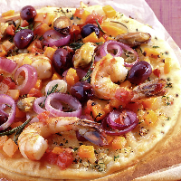FRESH DOUGH PIZZA TOPPED WITH MARINATED SAUCE, PRAWNS, SHRIMPS, FISH & CHESSE